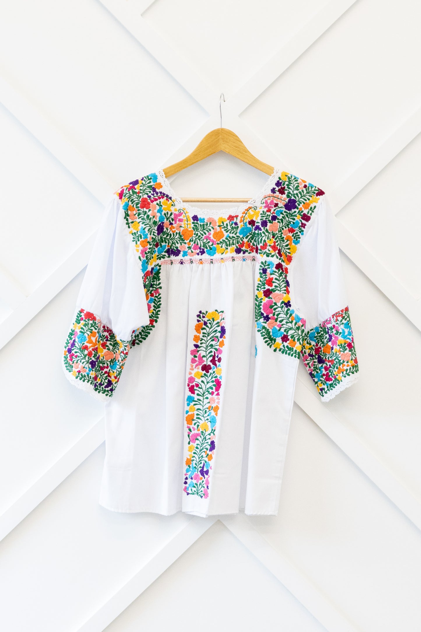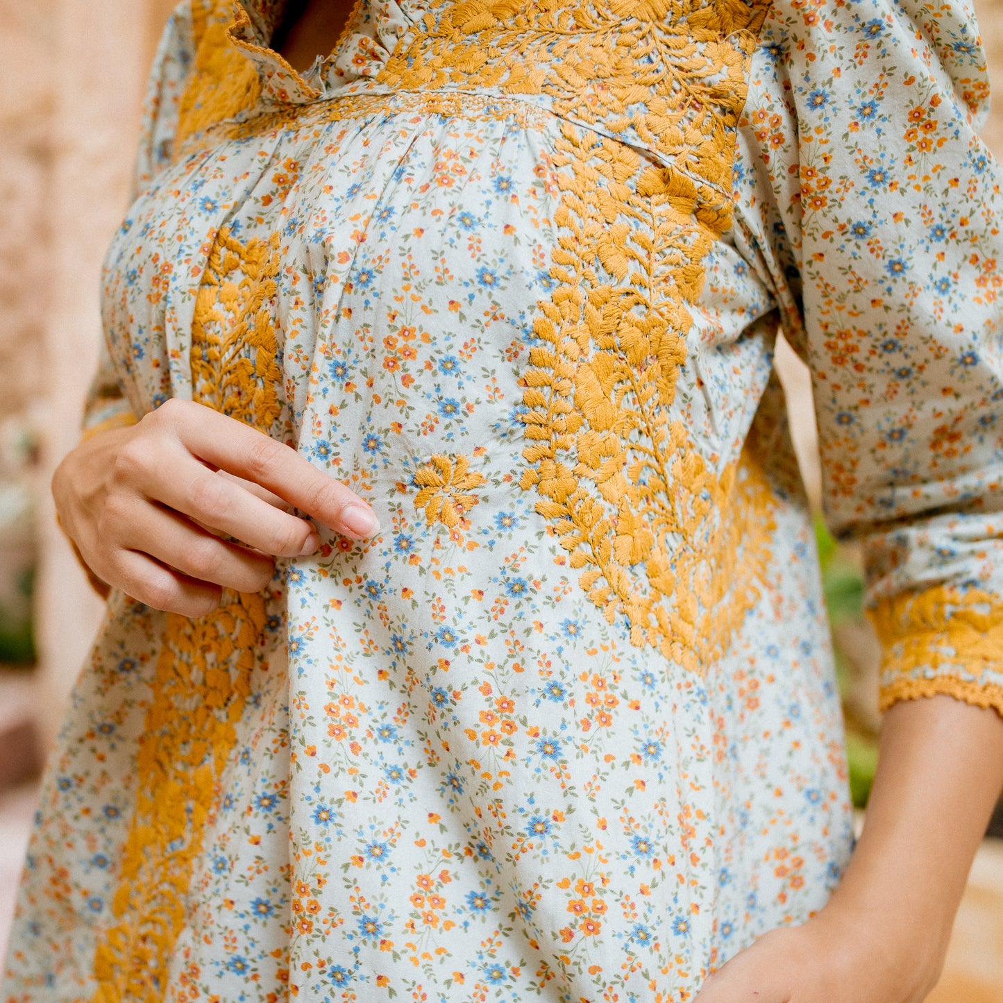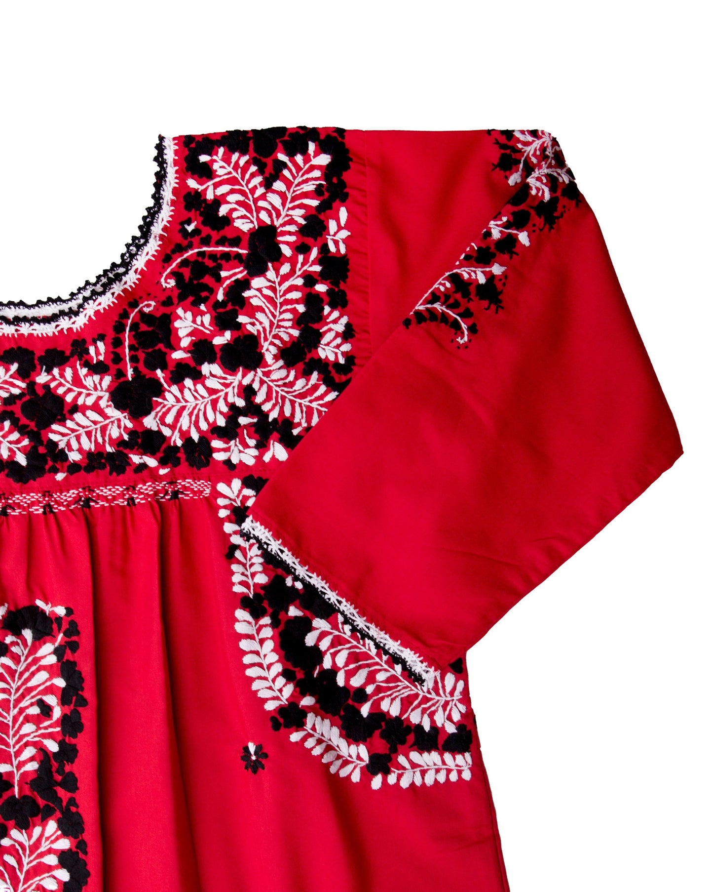 Exquisitely detailed, the Carmen features delicate hand-embroidered floral motifs across the upper bodice, with additional embroidery flowing under the arms and down the center for a balanced, artful finish. The ¾-length sleeves and neckline are adorned with hand-crocheted edging—applied directly into the fabric by skilled artisans—extending also to the side slits at the skirt’s hem, adding both movement and charm.