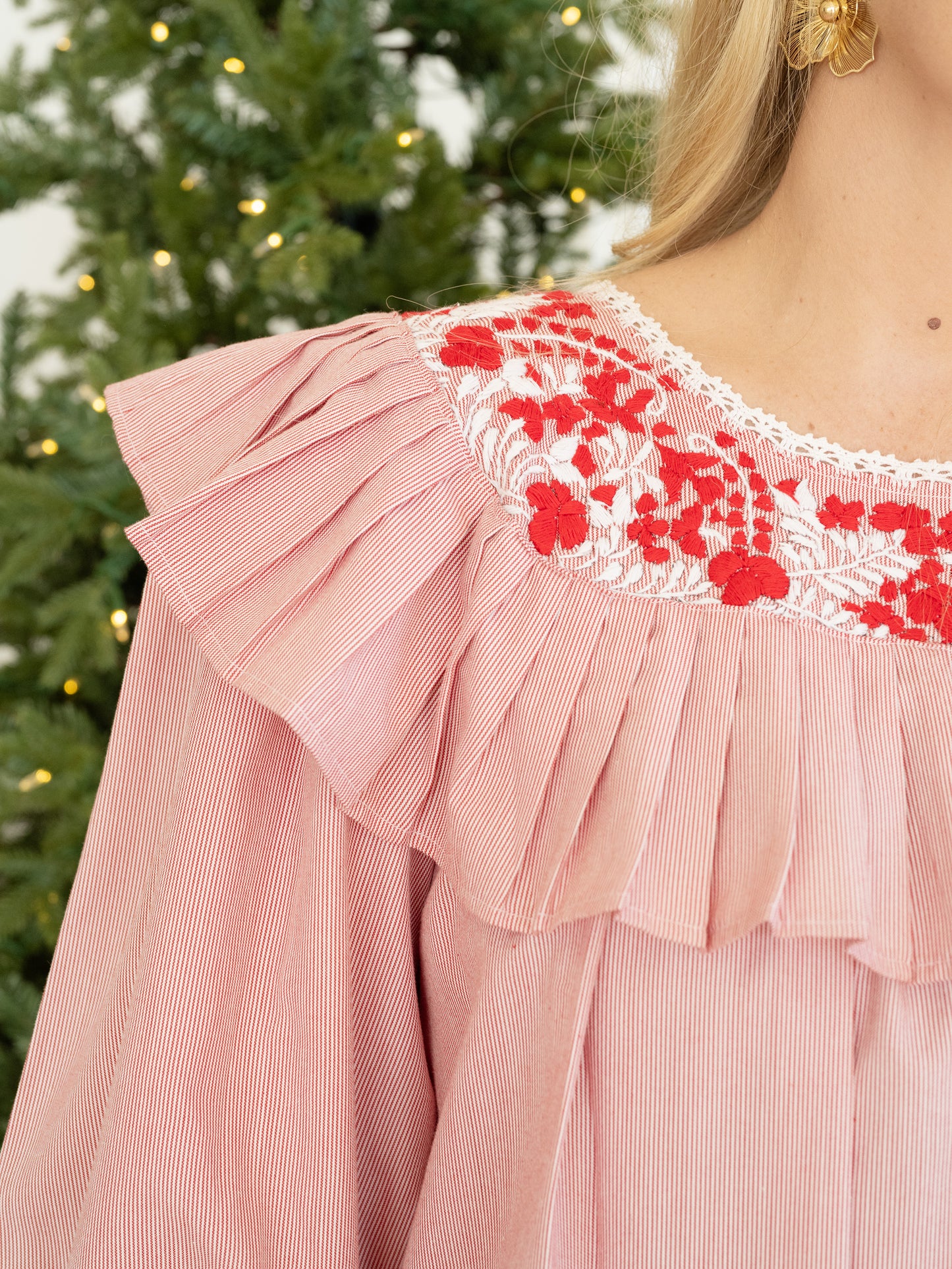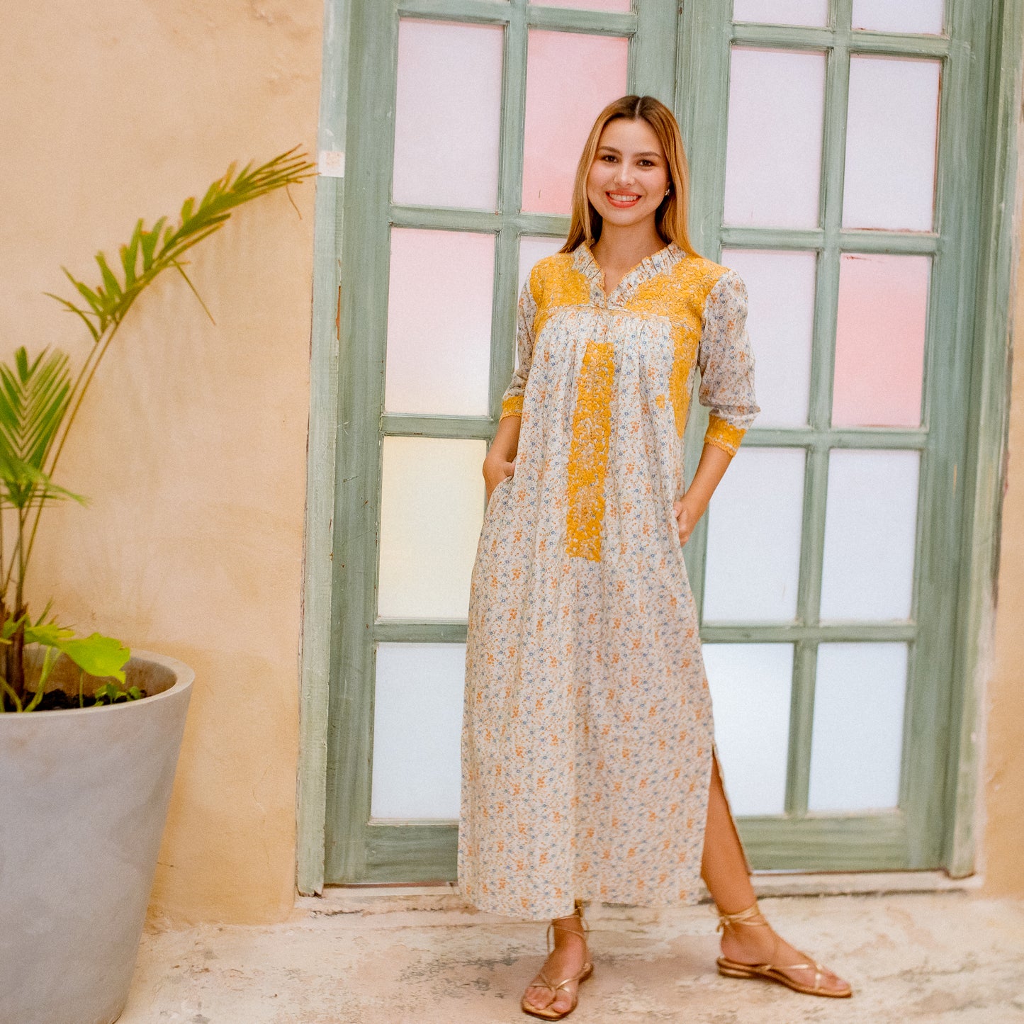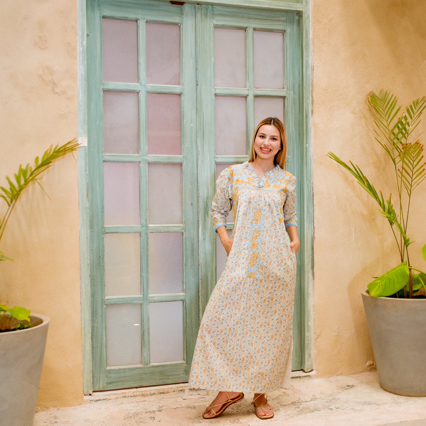 Exquisitely detailed, the Carmen features delicate hand-embroidered floral motifs across the upper bodice, with additional embroidery flowing under the arms and down the center for a balanced, artful finish. The ¾-length sleeves and neckline are adorned with hand-crocheted edging—applied directly into the fabric by skilled artisans—extending also to the side slits at the skirt’s hem, adding both movement and charm.