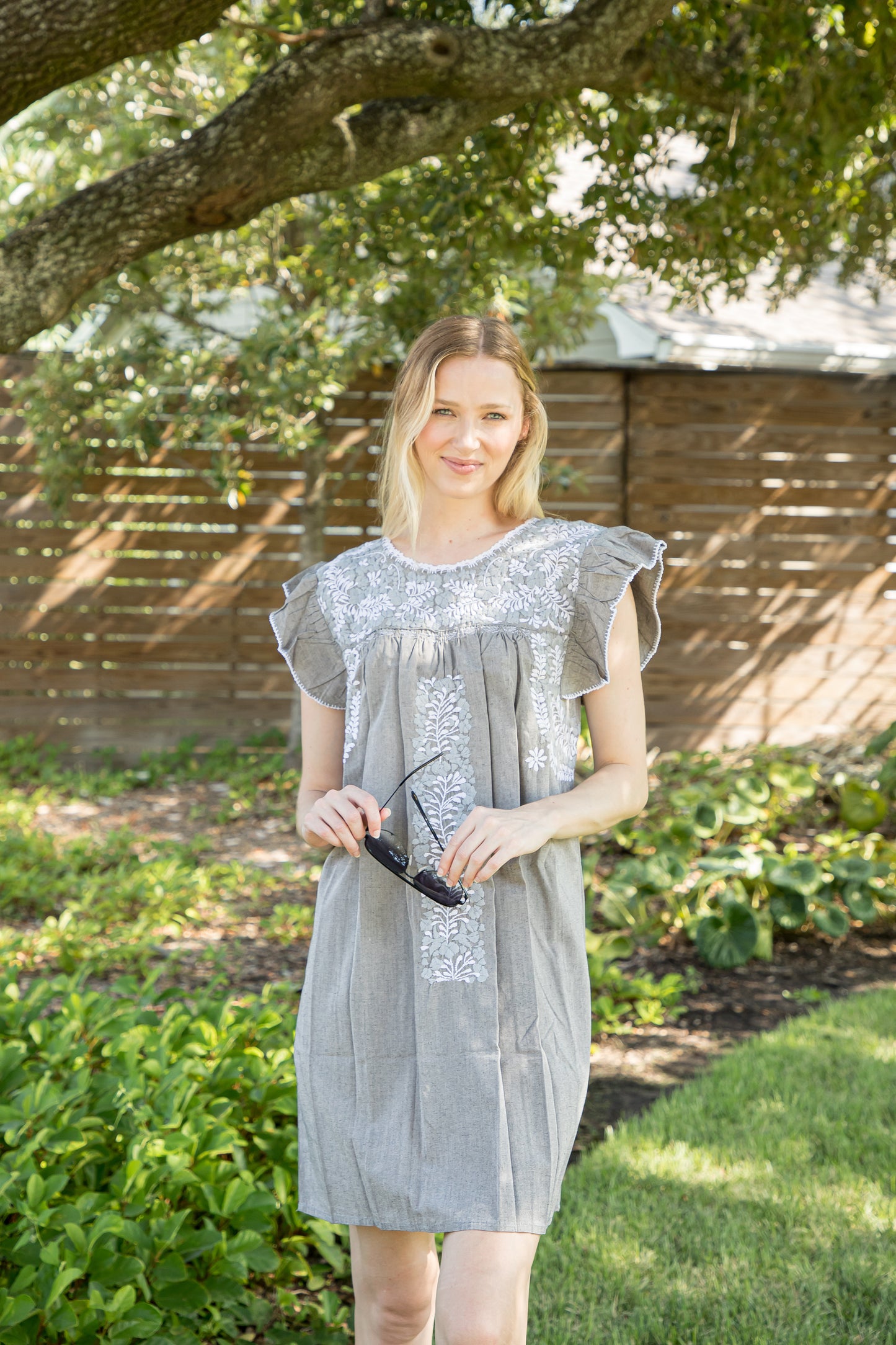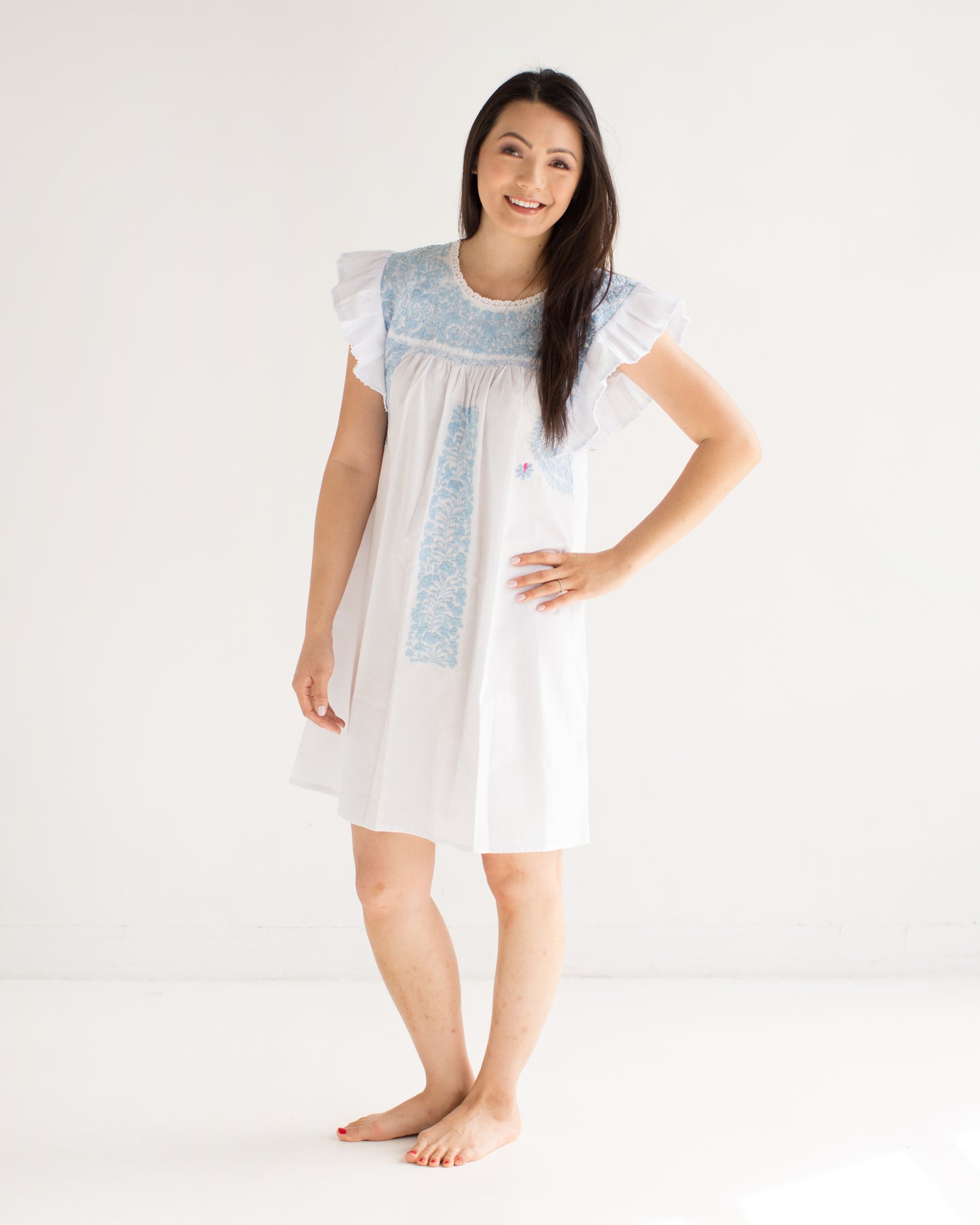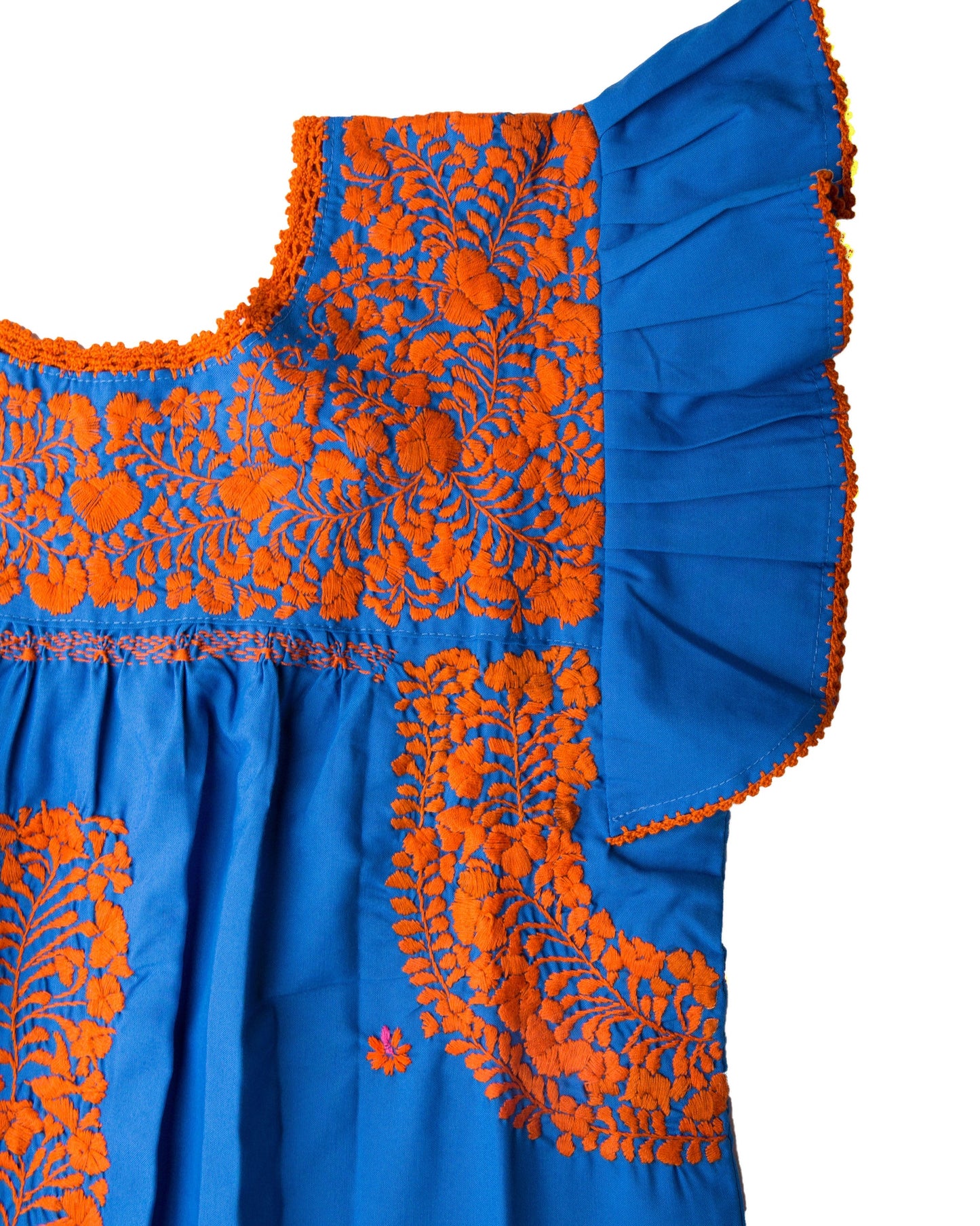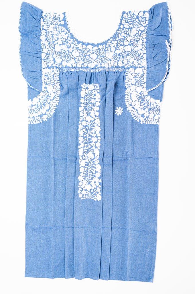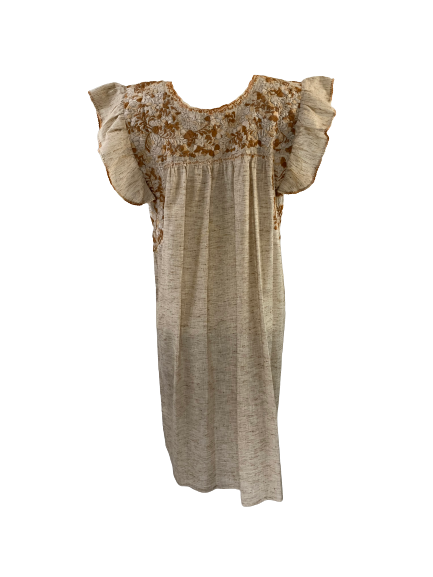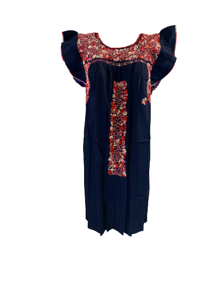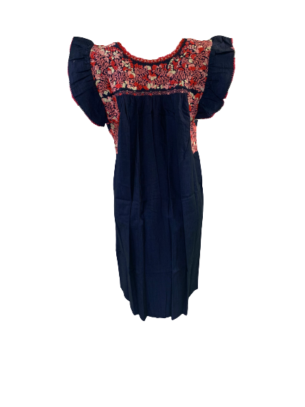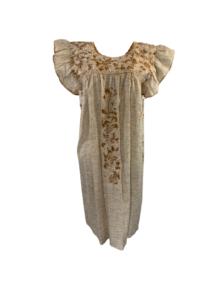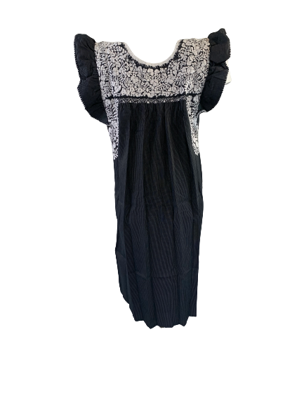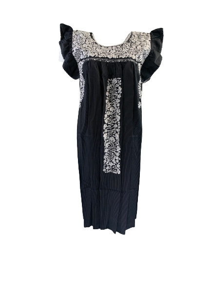 Women's Sara Ruffle Dress. Pleated knee-length, with single ruffled sleeve (3") features hand-embroidered flowers in the upper bust area. Embroidery details on underarm and down the center of the piece. This dress also has crochet detail around the neckline and sleeve applied directly to the fabric (not sewn on). 100% cotton embroidery thread.