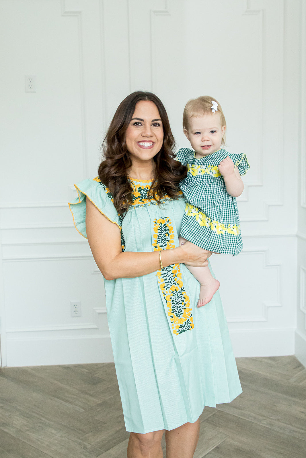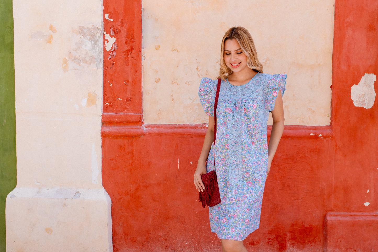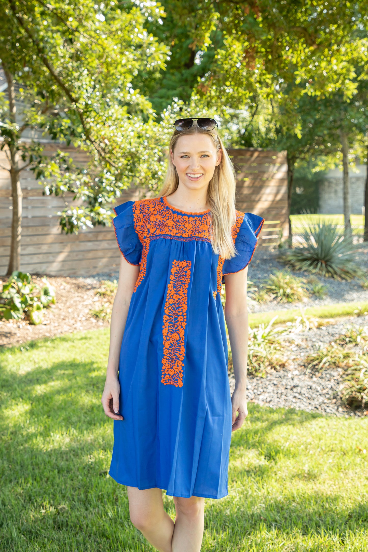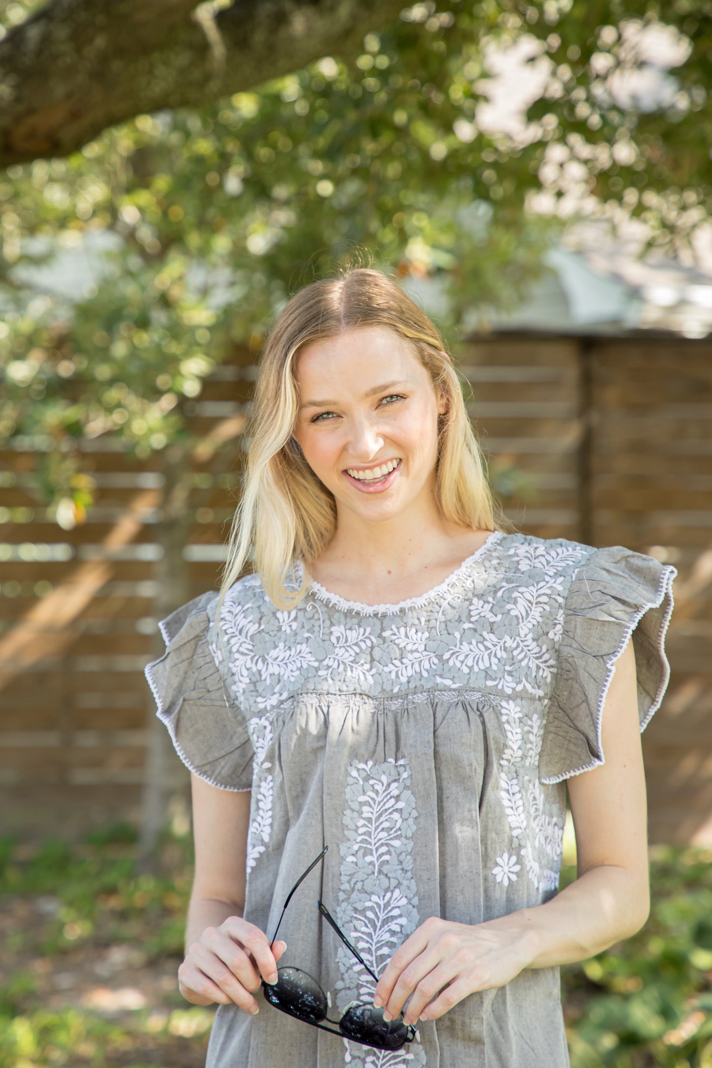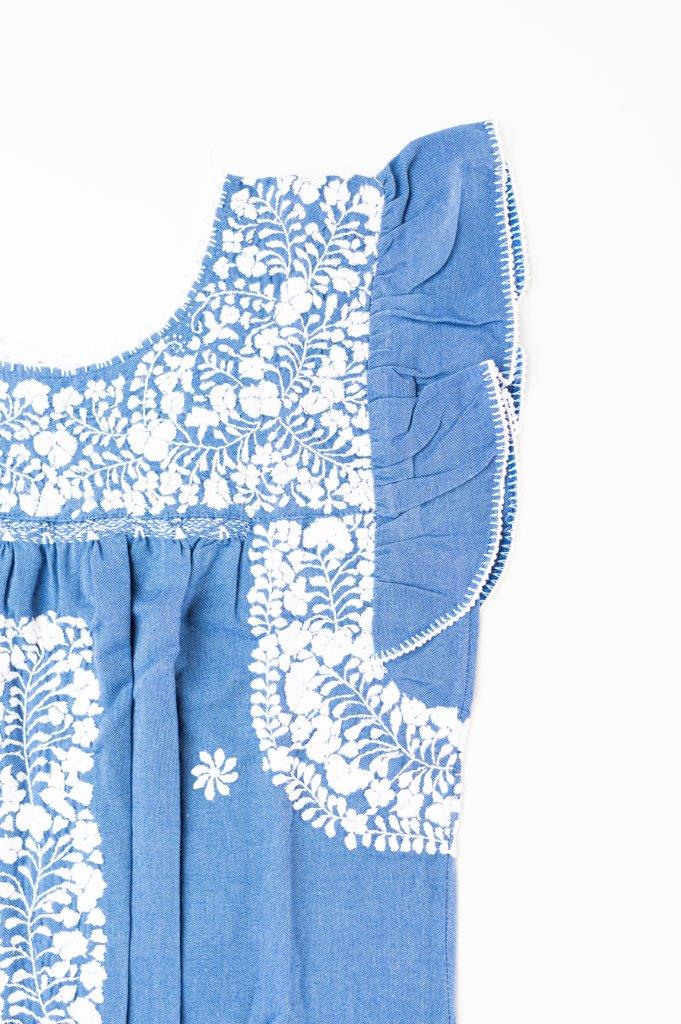 Women's Sara Ruffle Dress. Pleated knee-length, with single ruffled sleeve (3") features hand-embroidered flowers in the upper bust area. Embroidery details on underarm and down the center of the piece. This dress also has crochet detail around the neckline and sleeve applied directly to the fabric (not sewn on). 100% cotton embroidery thread.