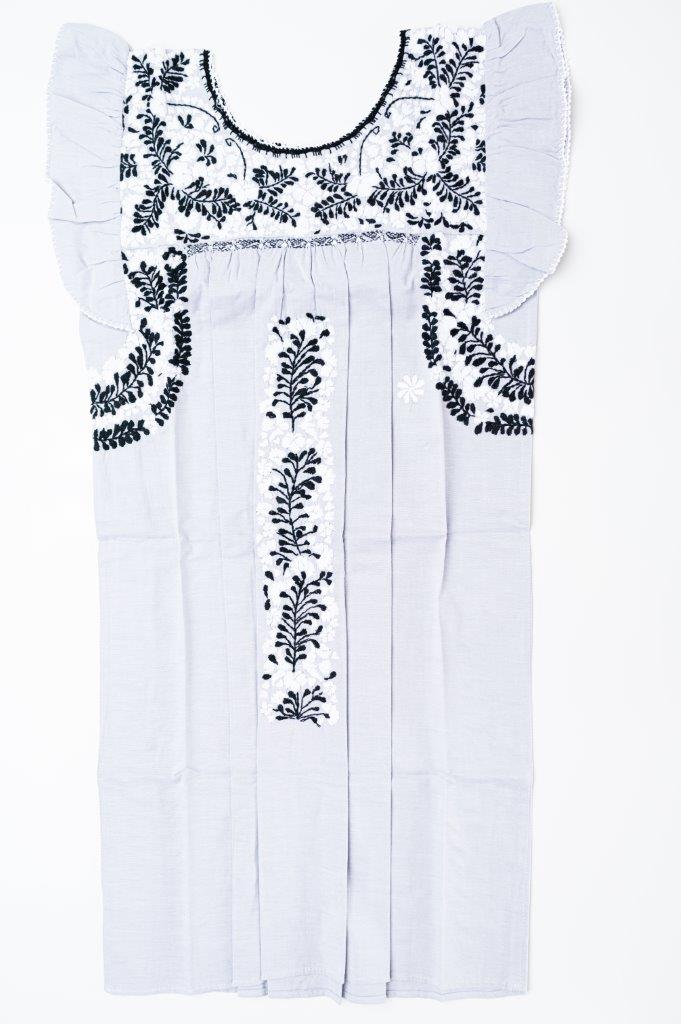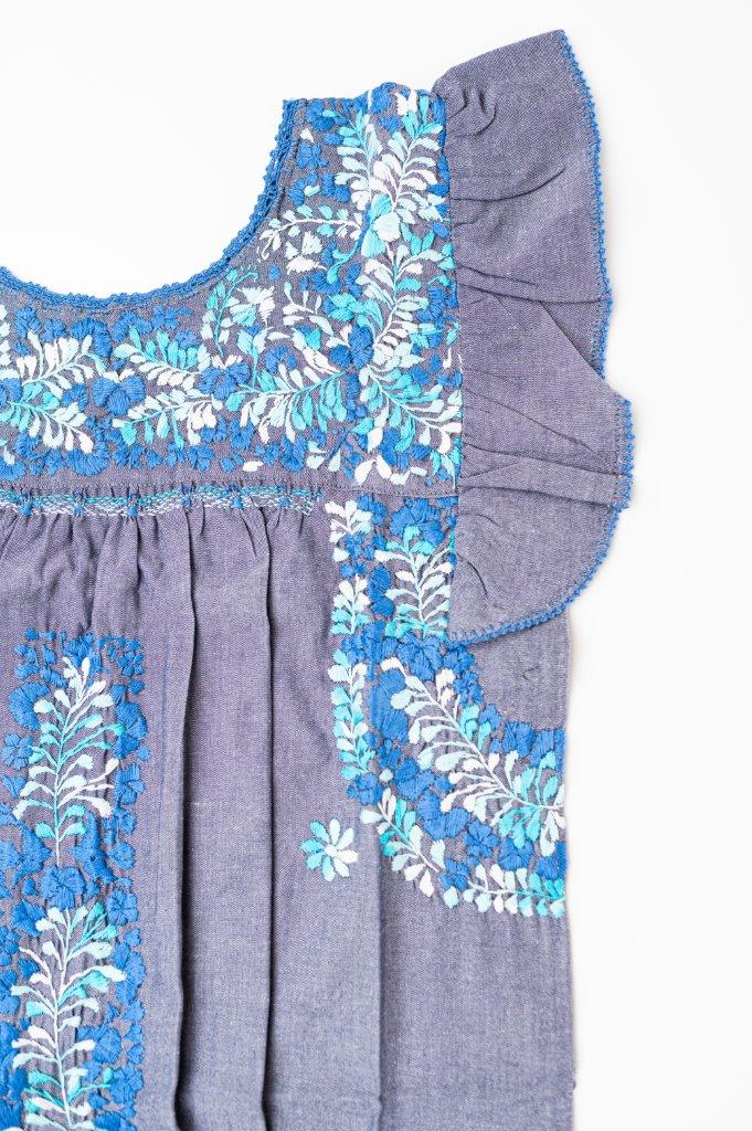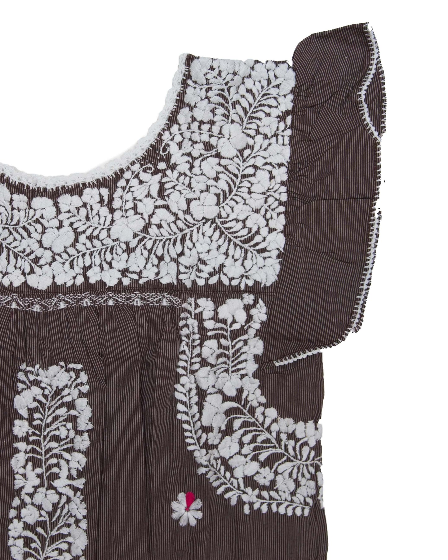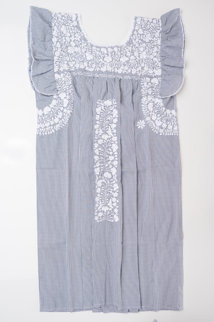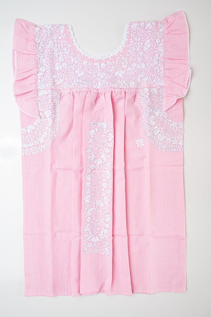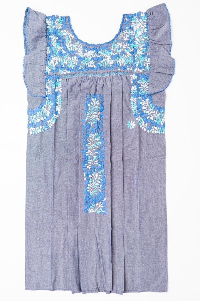 Women's Sara Ruffle Dress. Pleated knee-length, with single ruffled sleeve (3") features hand-embroidered flowers in the upper bust area. Embroidery details on underarm and down the center of the piece. This dress also has crochet detail around the neckline and sleeve applied directly to the fabric (not sewn on). 100% cotton embroidery thread.