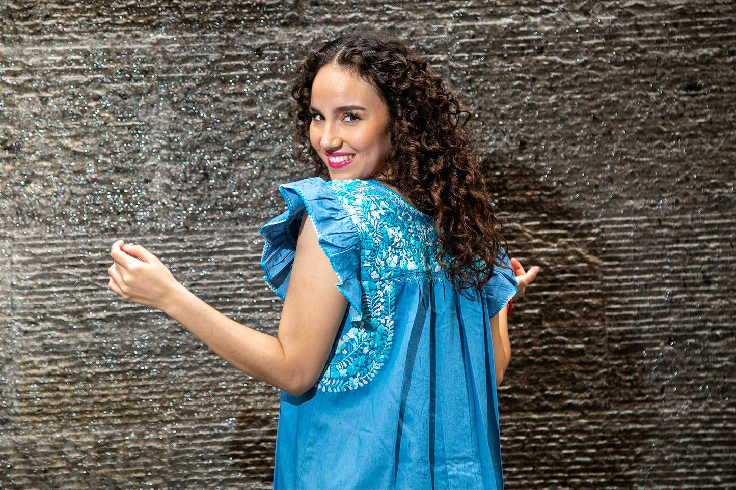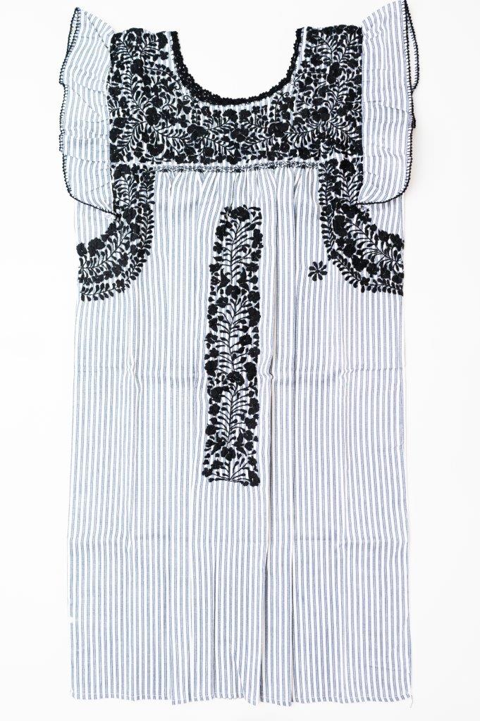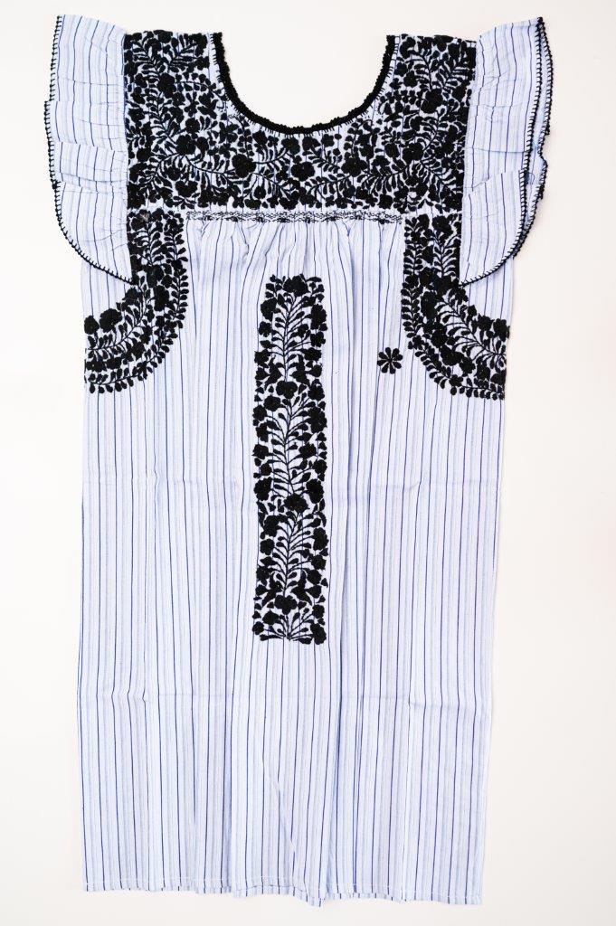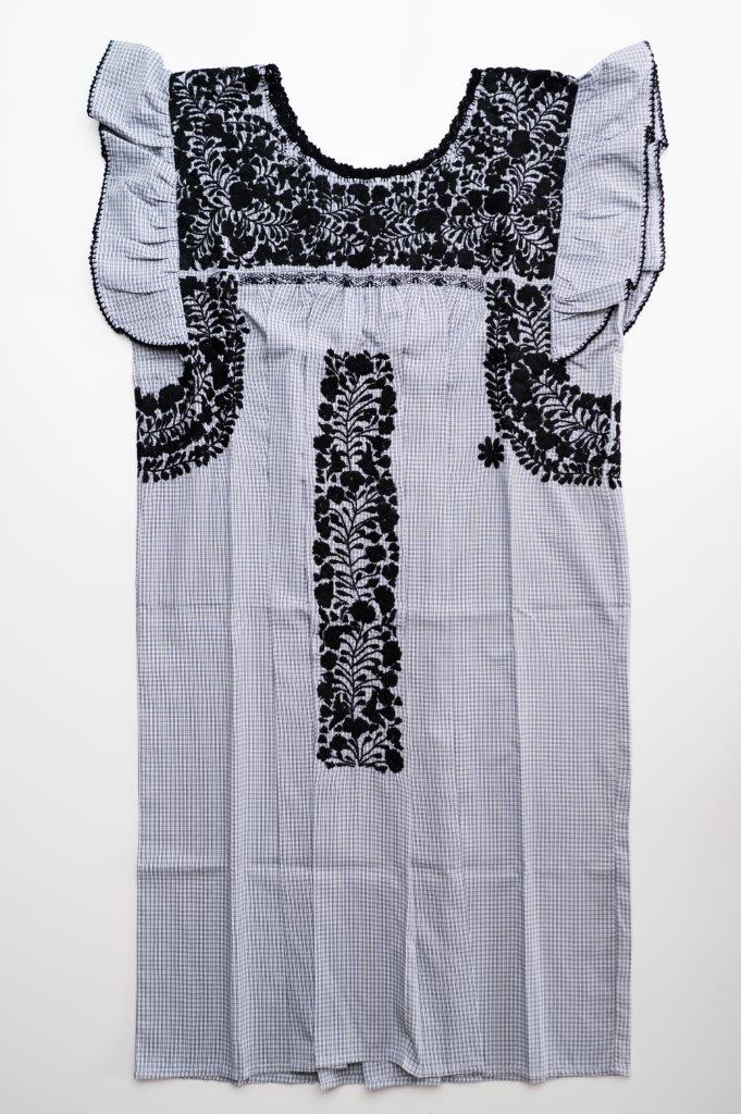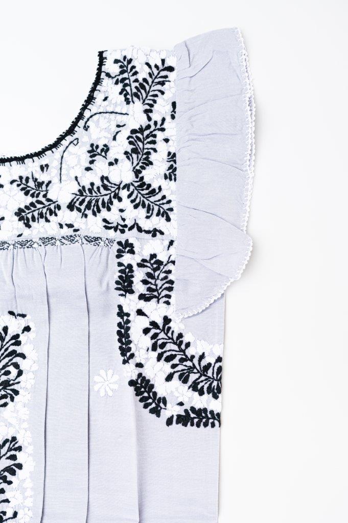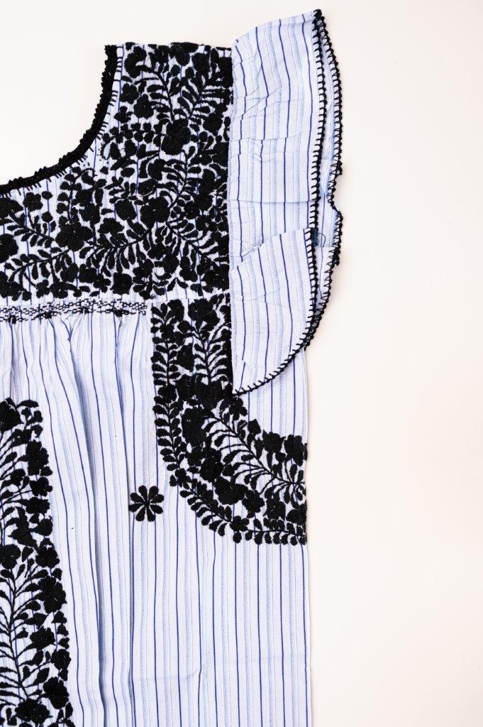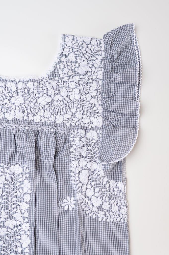 Women's Sara Ruffle Dress. Pleated knee-length, with single ruffled sleeve (3") features hand-embroidered flowers in the upper bust area. Embroidery details on underarm and down the center of the piece. This dress also has crochet detail around the neckline and sleeve applied directly to the fabric (not sewn on). 100% cotton embroidery thread.